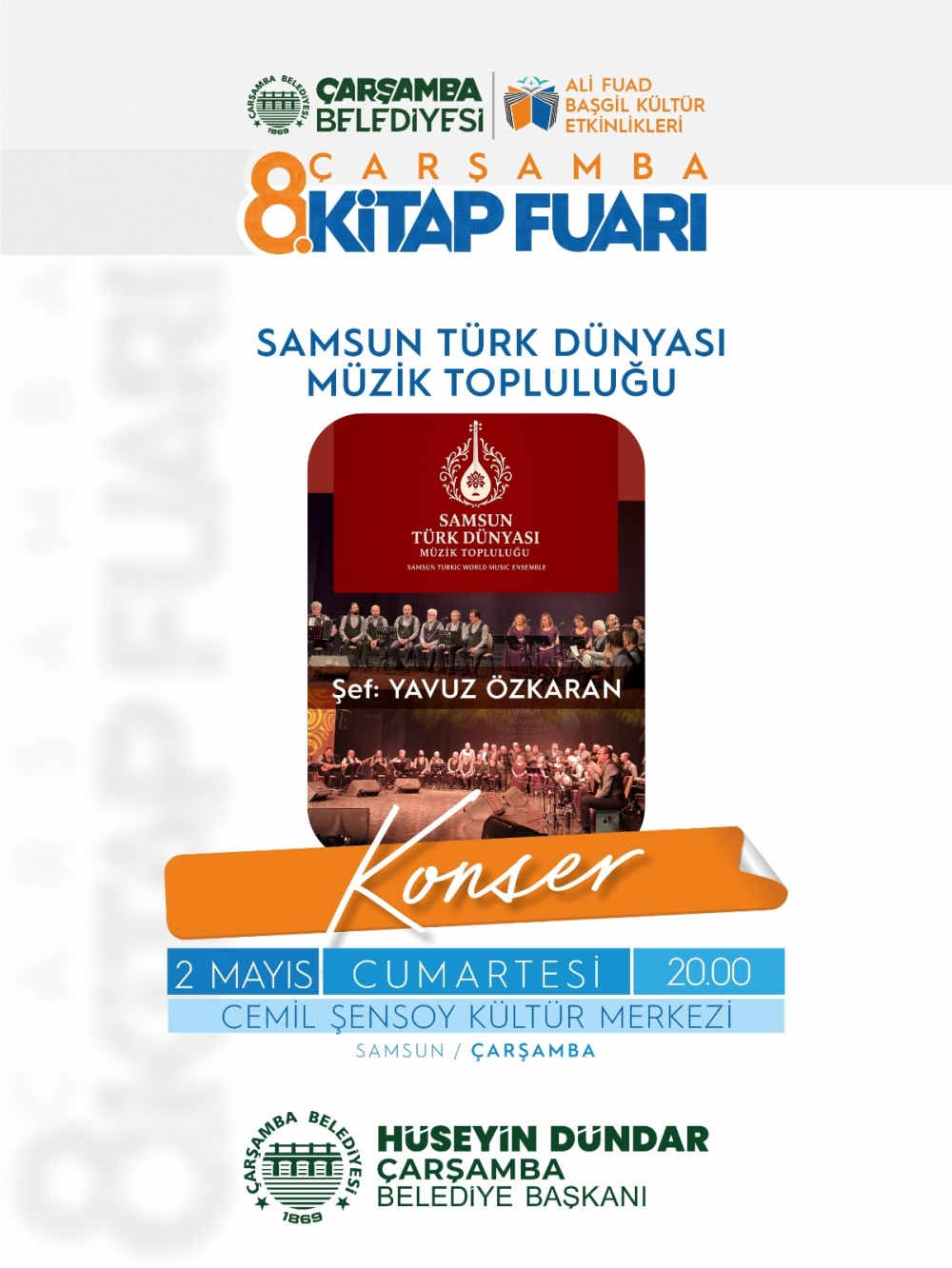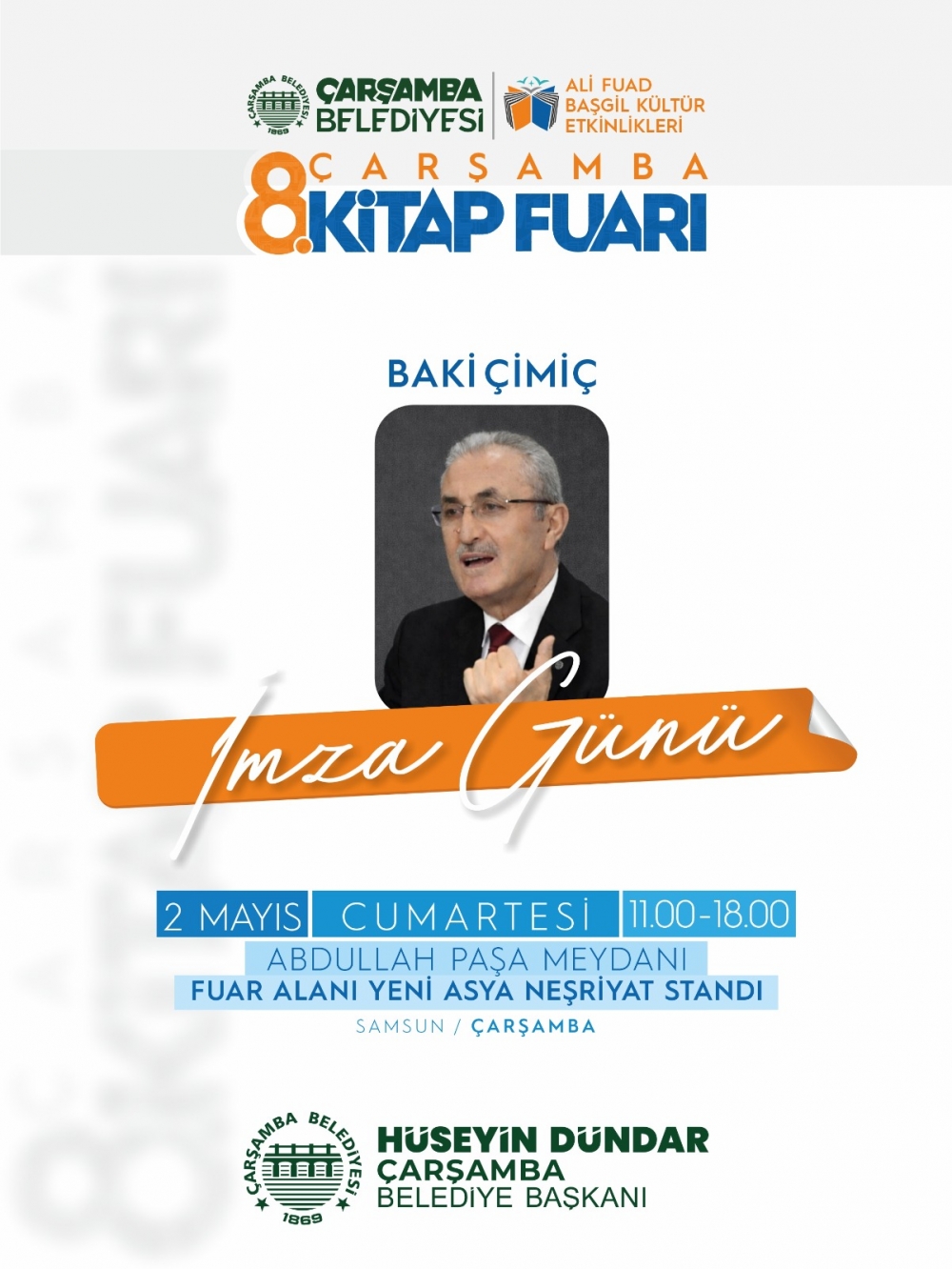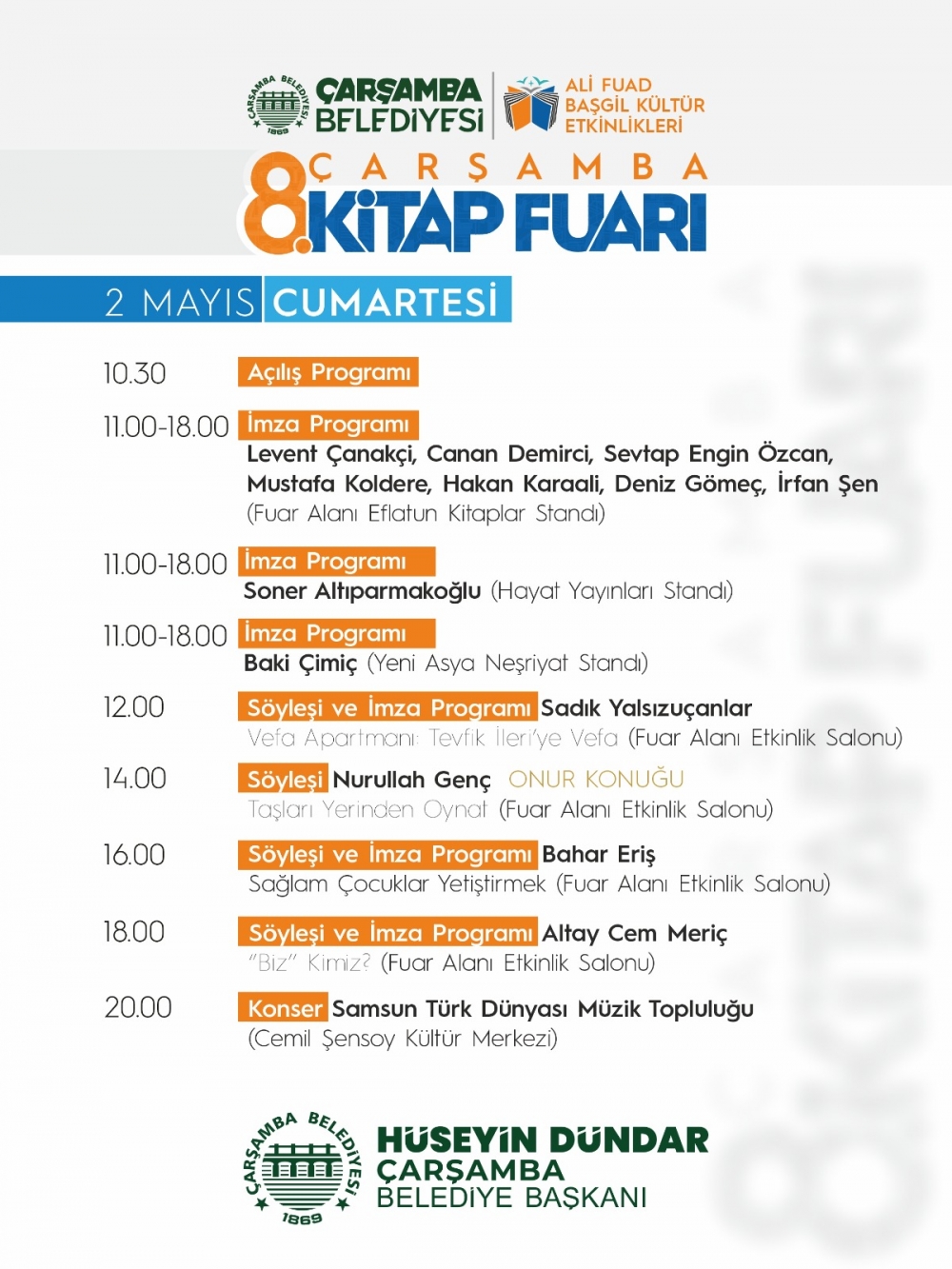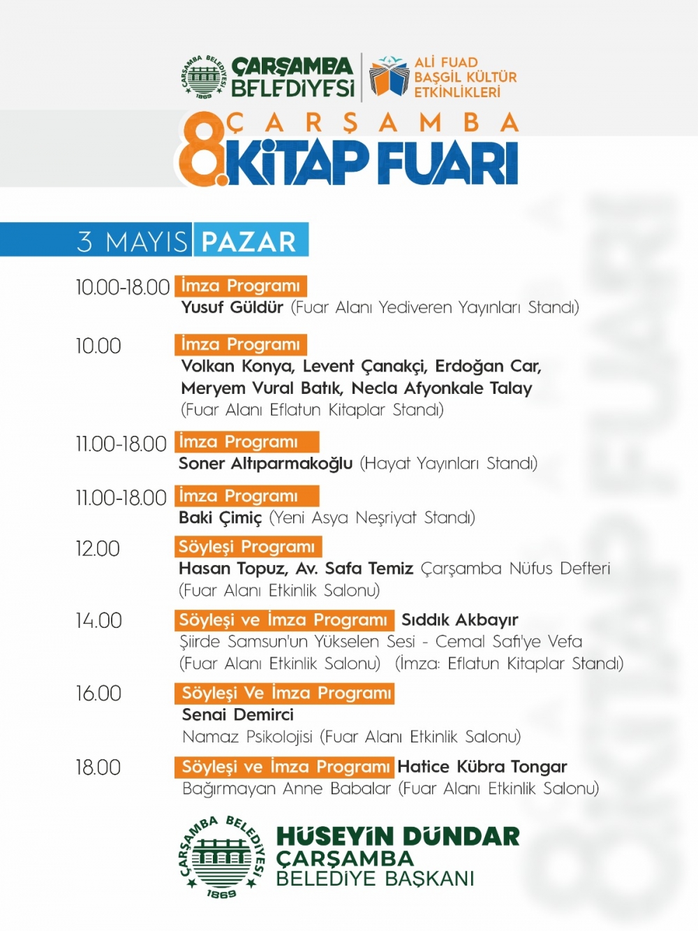 Çarşamba Belediye Başkanı Hüseyin Dündar, geçtiğimiz yıllarda büyük ilgi gören kitap fuarının bu yıl da zengin içerikle gerçekleştirileceğini belirtti. Söyleşiler, imza günleri ve çeşitli kültürel etkinliklerle dolu dolu geçecek fuar; kitapseverleri, yazarları ve yayınevlerini bir araya getirecek. Bu yıl fuarda 100’ün üzerinde yazar ve 70’ten fazla yayınevi yer alacak.